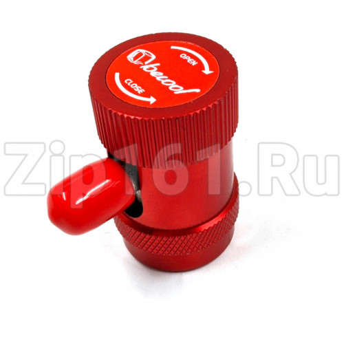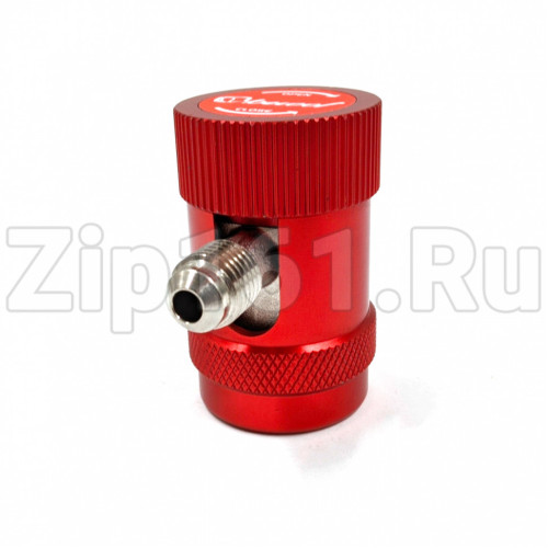 Область применения, описание компонента: Быстросъемная муфта высокого давления (красная) для подсоединения к порту заправки и диагностики автомобильных кондиционеров, работающих на хладагенте R134a, или малых рефрижераторных установок на R404a. Быстросъёмная муфта высокого давления с вентилем, предназначена для подсоединения к порту высокого давления автомобильного кондиционера без открытия доступа к системе циркуляции хладагента. Поворота вентиля по часовой стрелке приводит в действие механизм опускания штока-депрессора, который нажимает на золотник и, тем самым, открывает доступ к системе циркуляции хладагента. Вентиль позволяет избежать механических поломок, связанных с физическим сопротивлением внутреннему давлению системы. Без вентиля, пытаясь подсоединить порт, возможно сломать трубку, на которой расположен порт. Преимущества быстросъёмных муфт: Быстросъёмная муфта в