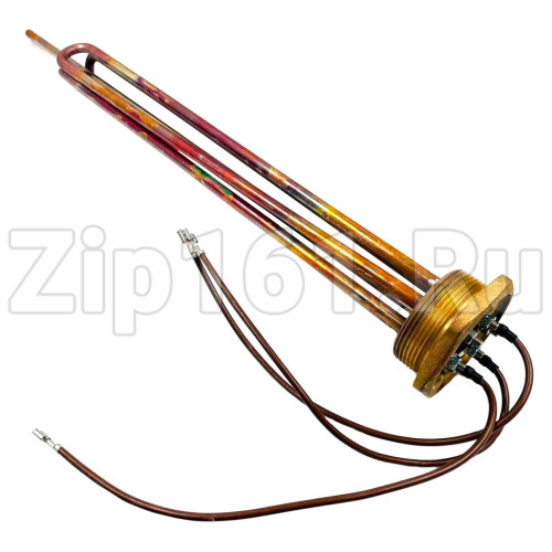 Прямой блок ТЭН мощностью 6,0кВт и напряжением каждого ТЭНа 380В, имеет резьбовой фланец G2 (≈59мм.) в который впаяно три ТЭНа по 2,0кВт каждый и трубка под датчик температуры. Общий габарит от начала резьбы фланца до верхней точки (установочный размер) 480мм., устанавливается в различные электрические котлы отопления, бойлеры, а так же промышленные емкости и установки. Подключение на 380В схемой соединения "треугольник". Технические характеристики: Артикул: 3401005Производство: Thermowatt (Италия)Мощность: 6000W (3х2000W)Напряжение: 380VМатериал оболочки: МедьУстановочный габарит: 480мм.Тип фланца: РезьбовойМатериал фланца: ЛатуньДиаметр резьбы: G2 (≈59мм.)
