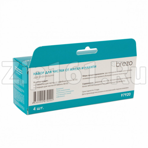 Набор для чистки кофемашин от накипи, 2 таблетки, 2 порции Brezo 97920 Длина: 0.156 Ширина в упаковке, м: 0.045 Длина в упаковке, м: 0.156 Высота в упаковке, м: 0.06 Вес в упаковке, кг: 0.125 Вид индивидуальной упаковки: Коробка Состав: Лимонная кислота, вспомогательные вещества, кислородное чистящее средство (>30%), фосфаты
