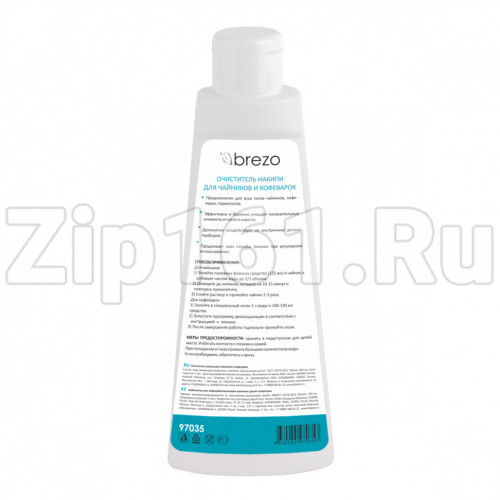 Очиститель накипи для чайников и кофеварок, 250 мл Brezo 97035 Универсальный очиститель накипи BREZO предназначен для всех типов чайников, кофеварок, термопотов. Эффективно и бережно очищает нагревательные элементы от известкового налета. Деликатно воздействует на внутренние детали приборов. При регулярном использовании продлевает срок службы техники. СПОСОБ ПРИМЕНЕНИЯ. Для чайников: залейте половину флакона средства (125 мл) в чайник и добавьте чистой воды до 2/3 объема. Доведите до кипения, оставьте на 10-15 минут и повторно прокипятите. Слейте раствор и промойте чайник 2-3 раза. Для кофеварок: залейте в специальный отсек 1 л воды и 100-130 мл средства. Согласно инструкции к оборудованию, запустите программу декальцинации. После завершения работы тщательно промойте отсек. МЕРЫ ПРЕДОСТОРОЖНОСТИ: хранить в недоступном для детей месте, не употреблять в пищевых целях. Избегать контакта с глазами и кожей. При попадании в глаза промыть большим количес