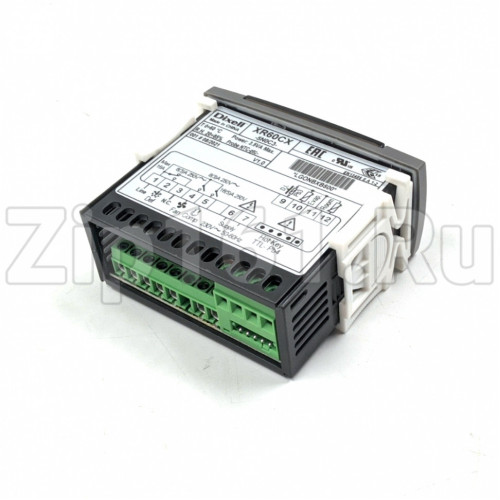 Модель Dixell XR60CX , формата 32 x 74 мм - это микропроцессорный контроллер, подходящий для применения в средне- или низкотемпературных холодильных установках с вентиляцией. У него есть 3 релейных выхода для управления компрессором, вентилятором, оттайкой, которая может быть либо электрической, либо с реверсивным циклом (горячий газ). Он также снабжен тремя входами датчиков NTC или PTC, первый - для контроля температуры, второй, расположенный на испарителе - для контроля температуры окончания оттайки и управления вентилятором, третий датчик, опциональный, подключается к разъему HOT KEY и используется для подачи сигнала аварии по температуре конденсатора или для показа температуры. Цифровой вход может работать как четвертый датчик температуры. Выход HOT KEY позволяет подключать блок с помощью внешнего модуля XJ485-CX к сети, совместимой с ModBUS-RTU , такой как блоки мониторинга Dixell семейства XWEB. Также он позволяет программировать контроллер с помощью ключа программирования HOT KEY. Прибор пол